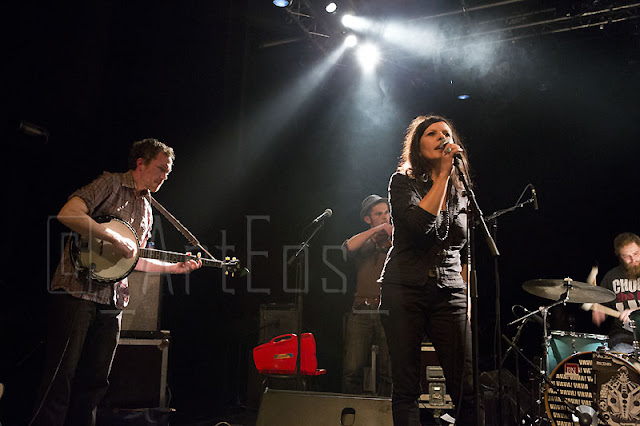 Feu Robertson, une joyeuse équipe un peu hippie nous offre une pluie de délectables notes, la guitare virevolte, le pipeau apporte sa touche aiguë et presque antique, les chants en anglais qui nous entraîneraient presque en quelques contrées du grand ouest américain. Régulièrement, une jeune femme passe sur l’arrière-scène brandissant à la manière des hôtesses sur les rings de boxe un panneau portant l’inscription « joyeux anniversaire » (décidément, RSE est propice aux célébrations d’anniversaires…). Puis un panneau nous dit que nous ne serions pas au bout de nos peines (plutôt plaisir que peine). Feu Robertson, c’est six hommes et une femme. Ça sonne presque comme un titre de Lelouch, en plus gang. Dans la salle, plongée dans une chaude pénombre, l’on peut croiser édiles de la Ville et artistes. Bref, du beau monde pour un beau concert